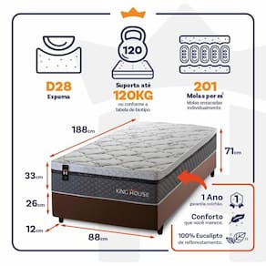 - Altura: 33 cm (colchão) + 26 cm (box) + 12 cm (pés) = 71 cm de altura;