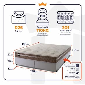 - Altura: 22 cm (colchão) + 26 cm (box) + 12 cm (pés) = 60 cm de altura;
