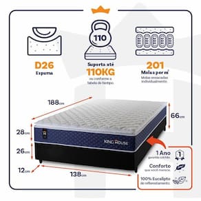 Feito com os mais nobres materiais em sua composição, ele conta com espuma D26 e molas ensacadas. Por ser mais macio, o colchão de molas ensacadas individualmente traz benefícios e ajuda no alinhamento da coluna. O colchão King House acomoda melhor o contorno do corpo, dispondo de forma correta quadris e ombros, expulsando as dores e problemas de coluna.