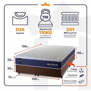 - Altura: 28 cm (colchão) + 26 cm (box) + 12 cm (pés) = 66 cm de altura;