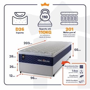 - Altura: 28 cm (colchão) + 26 cm (box) + 12 cm (pés) = 66 cm de altura;