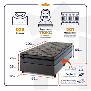 - Altura: 26 cm (colchão) + 26 cm (box) + 12 cm (pés) = 64 cm de altura;