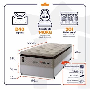 - Altura: 35 cm (colchão) + 26 cm (box) + 12 cm (pés) = 73 cm de altura;