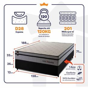 - Altura: 33 cm (colchão) + 26 cm (box) + 12 cm (pés) = 71 cm de altura;