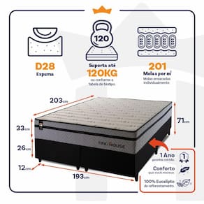 - Altura: 33 cm (colchão) + 26 cm (box) + 12 cm (pés) = 71 cm de altura;