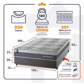 Feito com os mais nobres materiais em sua composição, ele conta com espuma D28 e molas ensacadas. Por ser mais macio, o colchão de molas ensacadas individualmente traz benefícios e ajuda no alinhamento da coluna. O colchão King House acomoda melhor o contorno do corpo, dispondo de forma correta quadris e ombros, expulsando as dores e problemas de coluna.