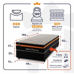 Medidas do Colchão: 88x188x27 cm, 96X203x27 cm, 128x188x27 cm,138x188x27 cm, 158x198x27 cm, 193x203x27 cm.
