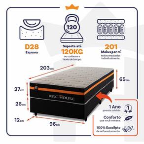 Feito com os mais nobres materiais em sua composição, ele conta com espuma D28 e molas ensacadas. Por ser mais macio, o colchão de molas ensacadas individualmente traz benefícios e ajuda no alinhamento da coluna. O colchão King House acomoda melhor o contorno do corpo, dispondo de forma correta quadris e ombros, expulsando as dores e problemas de coluna.