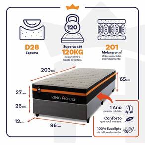 - Altura: 27 cm (colchão) + 26 cm (box) + 12 cm (pés) = 65 cm de altura;