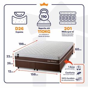 - Altura: 22 cm (colchão) + 26 cm (box) + 12 cm (pés) = 60 cm de altura;