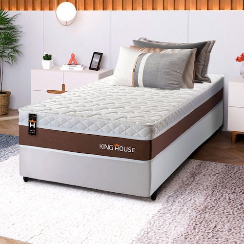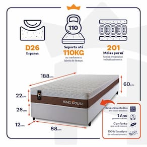 Feito com os mais nobres materiais em sua composição, ele conta com espuma D26 e molas ensacadas. Por ser mais macio, o colchão de molas ensacadas individualmente traz benefícios e ajuda no alinhamento da coluna. O colchão King House acomoda melhor o contorno do corpo, dispondo de forma correta quadris e ombros, expulsando as dores e problemas de coluna.