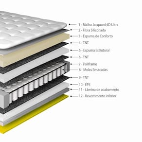 - Espumas Espuma de poliuretano D-26 certificada + EPS Espumas Progressivas no pilow para maior confordo e adequação aos diferentes biotipos. Manta acrilica + Espuma Soft.
