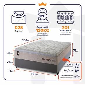 - Altura: 33 cm (colchão) + 26 cm (box) + 12 cm (pés) = 71 cm de altura;