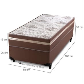 Largura: 88 cmAltura colchão: 19 cmAltura base: 26 cm Altura colchão + Base + Pés: 57 cmProfundidade: 188 cmPeso: 27,19 kgGarantia Colchão: 12 MesesGarantia Base: 03 MesesInformações Adicionais: Não possuímos serviço de montagem. Todos os móveis possuem garantia e manual de montagem, Não nos responsabilizamos pelos custos de montagem. É de extrema importância ficar atento às dimensões dos produtos, pois é de sua total responsabilidade caso o produto tenha dimensões superiores ao local de acesso da entrega dificultando ou impossibilitando que a mesma seja concluída. Não nos responsabilizamos, no ato da entrega, por subir escadas, corredores e elevadores ou transporte por guincho em apartamentos. Não nos responsabilizamos por transtornos com a entrega caso o produto necessite de desmontagem, nem pelos custos gerados por esta situação. Imagens meramente ilustrativas a cor, pode variar de acordo com a iluminação do ambiente. Itens de decoração não inclusos.
