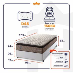 - Altura: 24 cm (colchão) + 26 cm (box) + 12 cm (pés) = 62 cm de altura;