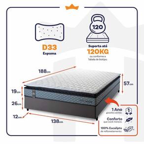 Feito com os mais nobres materiais em sua composição, ele conta com espuma D33 . O colchão King House acomoda melhor o contorno do corpo, dispondo de forma correta quadris e ombros, expulsando as dores e problemas de coluna.