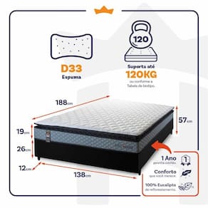 - Altura: 19 cm (colchão) + 26 cm (box) + 12 cm (pés) = 57 cm de altura;