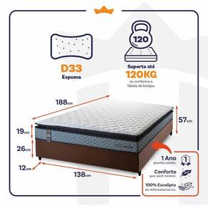 - Altura: 19 cm (colchão) + 26 cm (box) + 12 cm (pés) = 57 cm de altura;