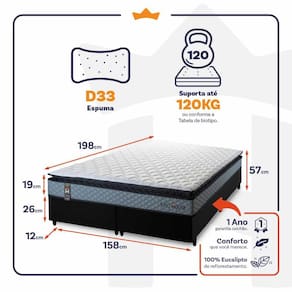 - Altura: 19 cm (colchão) + 26 cm (box) + 12 cm (pés) = 57 cm de altura;