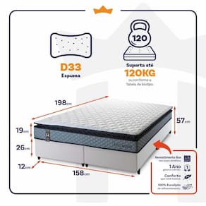 - Altura: 19 cm (colchão) + 26 cm (box) + 12 cm (pés) = 57 cm de altura;