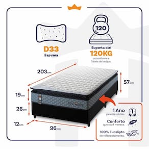 - Altura: 19 cm (colchão) + 26 cm (box) + 12 cm (pés) = 57 cm de altura;