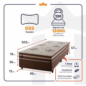 - Altura: 19 cm (colchão) + 26 cm (box) + 12 cm (pés) = 57 cm de altura;