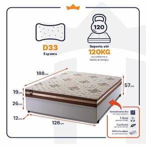 - Altura: 19 cm (colchão) + 26 cm (box) + 12 cm (pés) = 57 cm de altura;
