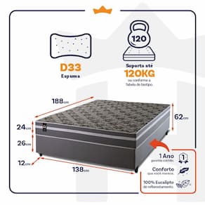 - Altura: 24 cm (colchão) + 26 cm (box) + 12 cm (pés) = 62 cm de altura;