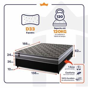 - Altura: 24 cm (colchão) + 26 cm (box) + 12 cm (pés) = 62 cm de altura;