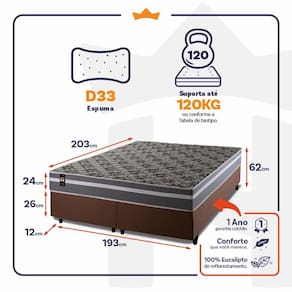 - Altura: 24 cm (colchão) + 26 cm (box) + 12 cm (pés) = 62 cm de altura;
