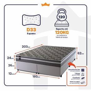 - Altura: 24 cm (colchão) + 26 cm (box) + 12 cm (pés) = 62 cm de altura;