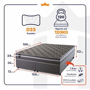 - Altura: 24 cm (colchão) + 26 cm (box) + 12 cm (pés) = 62 cm de altura;