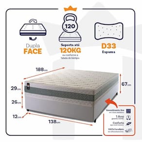 - Altura: 29 cm (colchão) + 26 cm (box) + 12 cm (pés) = 67 cm de altura;