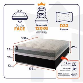 - Altura: 29 cm (colchão) + 26 cm (box) + 12 cm (pés) = 67 cm de altura;