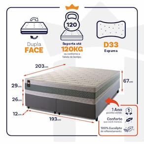 - Altura: 29 cm (colchão) + 26 cm (box) + 12 cm (pés) = 67 cm de altura;