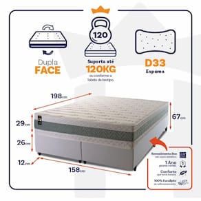 - Altura: 29 cm (colchão) + 26 cm (box) + 12 cm (pés) = 67 cm de altura;