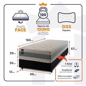 - Altura: 29 cm (colchão) + 26 cm (box) + 12 cm (pés) = 67 cm de altura;