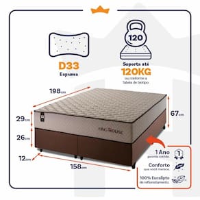 Feito com os mais nobres materiais em sua composição, ele conta com espuma D33 . O colchão King House acomoda melhor o contorno do corpo, dispondo de forma correta quadris e ombros, expulsando as dores e problemas de coluna.