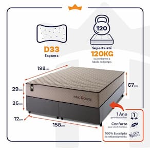 Feito com os mais nobres materiais em sua composição, ele conta com espuma D33 . O colchão King House acomoda melhor o contorno do corpo, dispondo de forma correta quadris e ombros, expulsando as dores e problemas de coluna.