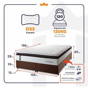 - Altura: 29 cm (colchão) + 26 cm (box) + 12 cm (pés) = 67 cm de altura;