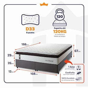 Feito com os mais nobres materiais em sua composição, ele conta com espuma D33 . O colchão King House acomoda melhor o contorno do corpo, dispondo de forma correta quadris e ombros, expulsando as dores e problemas de coluna.