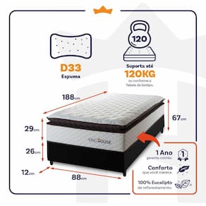 Feito com os mais nobres materiais em sua composição, ele conta com espuma D33 . O colchão King House acomoda melhor o contorno do corpo, dispondo de forma correta quadris e ombros, expulsando as dores e problemas de coluna.