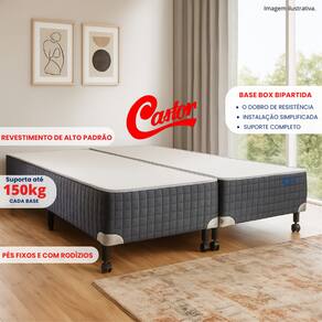 Conjunto Cama Box King Castor Silver Star + Colchão Tecnopedic One Face 193x203x32 com Base Bipartida O Conjunto Cama Box King Silver Star com Colchão Tecnopedic One Face da Castor foi desenvolvido para quem busca alto nível de conforto, resistência e sofisticação, reunindo qualidade, durabilidade e praticidade para o uso diário. O colchão conta com o exclusivo sistema de molejo Tecnopedic, que proporciona firmeza, estabilidade e excelente distribuição do peso corporal, auxiliando no alinhamento correto da coluna e garantindo noites de sono mais confortáveis. A tecnologia One Face elimina a necessidade de virar o colchão, oferecendo mais praticidade no dia a dia — basta apenas girá-lo periodicamente no sentido dos pés para a cabeceira. Seu revestimento superior matelassado de alto padrão garante toque macio, conforto superior e acabamento premium, enquanto a estrutura reforçada assegura alto desempenho e longa vida útil. A Base Box Castor Silver Star Air Bipartida complementa o conjunto com um design elegante e funcional. Revestida em suede cinza matelassado, com delicados bordados em branco, ela valoriza o ambiente e facilita o transporte e a instalação. Sua estrutura é produzida em madeira de Pinus e Eucatex, garantindo resistência, segurança e durabilidade. Os pés fixos de madeira e com rodízios proporcionam estabilidade e praticidade na movimentação. Como parte da linha premium da Castor, este conjunto é a escolha ideal para quem deseja unir conforto, estilo e qualidade superior, com a vantagem da base bipartida, que traz mais facilidade no dia a dia.