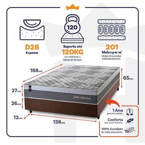 - Altura: 27 cm (colchão) + 26 cm (box) + 12 cm (pés) = 65 cm de altura;