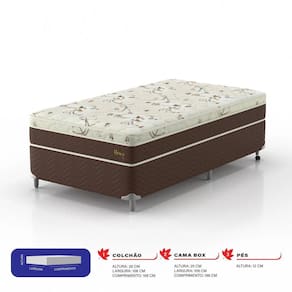 Colchão com Estrutura interna composta de molas ensacadas individualmente, Espuma poliuretano densidade 26kg/m3, EPS - Poliestireno Expandido, feltro resinado e TNT 100g. Faixa lateral e tampo no tecido sintel 100% Poliéster, fundo do produto TNT 100g ati derrapante. Cor da faixa lateral marrom, Tampo bege com estampa floral. Box com madeira pinus e eucalipito, revestido com tecido sintel cor marrom na faixa lateral, TNT 70g preto na parte de cima e na parte de baixo. Abertura para Ventilação: Não Acompanha Cama Auxiliar: Não Acompanha Colchão: Sim Altura da Base Box (Sem o Colchão): 25 Altura do Colchão (Sem a Base Box): 26 Ambiente Principal: Quarto Antiácaro: Sim Antialérgico: Sim Antifungo: Sim Cantoneiras: Sim Cor: Bege e Marrom Cor do Produto: Bege e Marrom Informações Complementares: Colchão com tecido 100% poliéster, design inovador e estampa floral, é um tecido mais resistente aos desgastes do dia a dia, pois não fura ou desfia com facilidade. Sua estrutura é composta por espuma poliuretano densidade 26kg/m2 que dá mais conforto par Itens Inclusos: 1 Colchão, 1 Box. Linha ou Coleção: Linha Manual de Montagem e Instalação: https://product-hub-prd.madeiramadeira.com.br/871083/documents/3dc0d862-c5a8-4b46-9980-d358d32849ac1539094manualboxsolteiro.pdf Material da Estrutura: Eucalipto Material dos Pés: Plástico Necessita Montagem: Sim Nível de Conforto: Intermediário Origem do Produto: Nacional Peso: 33.95 Pillow: Pillow Euro Possui Baú: Não Possui Pillow: Sim Precisa virar: Não Recomendações de Uso, Manutenção e Limpeza: Seguir manual de instruções. Revestimento: Poliéster Revestimento da Base Box: Acabamento com linhas poliéster Tamanho: Solteirão Tamanho de Colchão: Solteiro Tipo do Colchão: Mola
