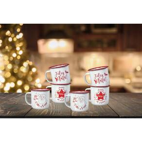 Jogo exclusivo com 6 unidades de canecas esmaltadas com 3 estampas natalinas diferentes! As canecas possuem a cor branca com estampa em vermelho, assim como sua borda!