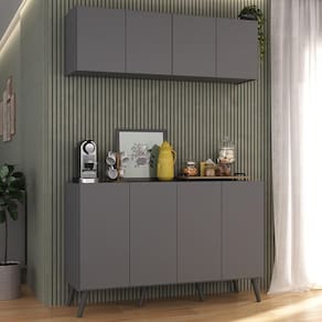 Receba seus convidados com estilo e sofisticação com o Conjunto Cantinho do Café Retrô Armário e Aparador 4 portas Multimóveis MP1084. Fabricado em MDP (15mm) com acabamento acetinado (cerca de 20% de brilho), garante durabilidade e resistência. Composto por um aparador e um armário aéreo com 4 portas e prateleiras, ele proporciona amplo espaço interno para organizar todos os itens necessários para a deliciosa hora do cafezinho. Seu design clean confere um visual moderno, combinando com qualquer tipo de decoração. Além disso, o aparador possui pés retrô em polipropileno que oferecem estabilidade e um charme vintage.