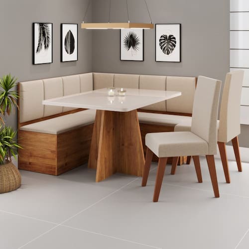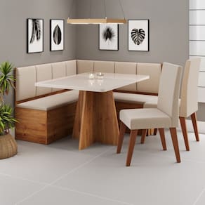 O conjunto canto baú Prestigio é uma solução inteligente para quem busca funcionalidade e beleza no mesmo ambiente, ideal também como divisor de espaços. A mesa possui base em MDP, tampo em MDF com vidro de 4mm e cantos arredondados, unindo segurança, durabilidade e sofisticação. O canto com baú embutido é perfeito para guardar objetos e manter tudo sempre organizado. Acompanha 2 cadeiras Milão produzidas em madeira maciça, garantindo resistência e firmeza. O assento das cadeiras conta com espuma D26, oferecendo o conforto ideal para refeições e momentos em família. O revestimento em tecido linho, presente tanto no canto quanto nas cadeiras, proporciona leveza, toque suave e um visual moderno ao conjunto. É uma escolha versátil que combina com diversos estilos de decoração. Ideal para cozinhas, salas de jantar ou espaços integrados. Um conjunto completo, elegante e funcional para transformar seu ambiente.