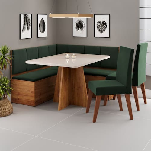 O conjunto canto baú Prestigio é uma solução inteligente para quem busca funcionalidade e beleza no mesmo ambiente, ideal também como divisor de espaços. A mesa possui base em MDP, tampo em MDF com vidro de 4mm e cantos arredondados, unindo segurança, durabilidade e sofisticação. O canto com baú embutido é perfeito para guardar objetos e manter tudo sempre organizado. Acompanha 2 cadeiras Milão produzidas em madeira maciça, garantindo resistência e firmeza. O assento das cadeiras conta com espuma D26, oferecendo o conforto ideal para refeições e momentos em família. O revestimento em tecido veludo, presente tanto no canto quanto nas cadeiras, proporciona leveza, toque suave e um visual moderno ao conjunto. É uma escolha versátil que combina com diversos estilos de decoração. Ideal para cozinhas, salas de jantar ou espaços integrados. Um conjunto completo, elegante e funcional para transformar seu ambiente.