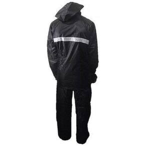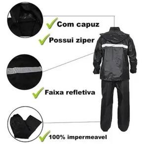 Capa de Chuva Conjunto Motoqueiro Delivery Motoboy Kit Capa e Calça com Fita Refletiva e Capuz 100% Impermeável Jaqueta com faixa refletiva nas costas. Cor: Preta Fechamento frontal com zíper. Fechamento calça com elástico Tamanho: Único Material: Poliéster e PVC Kit com 1 casaco e 1 calça Cintura da calça e mangas da blusa com Elástico Com embalagem para guarda no mesmo material
